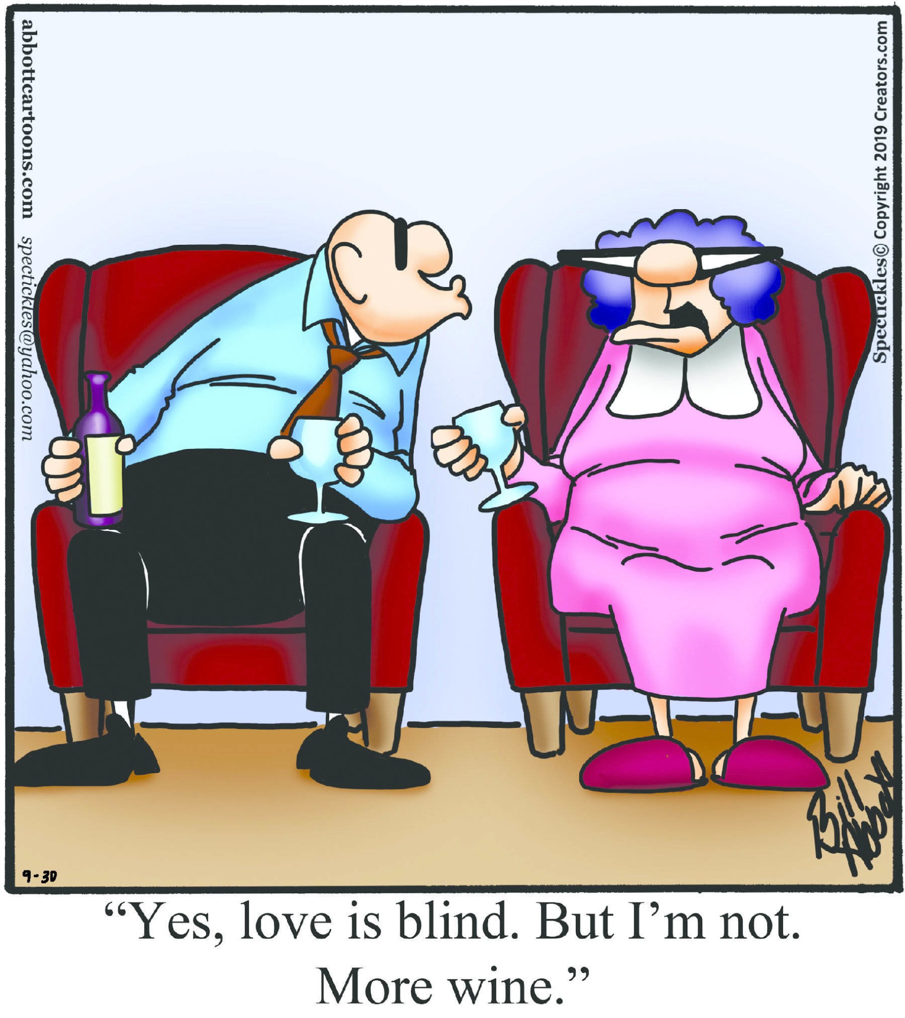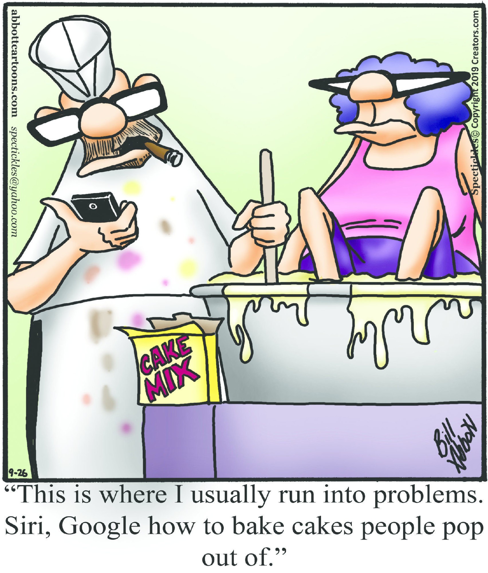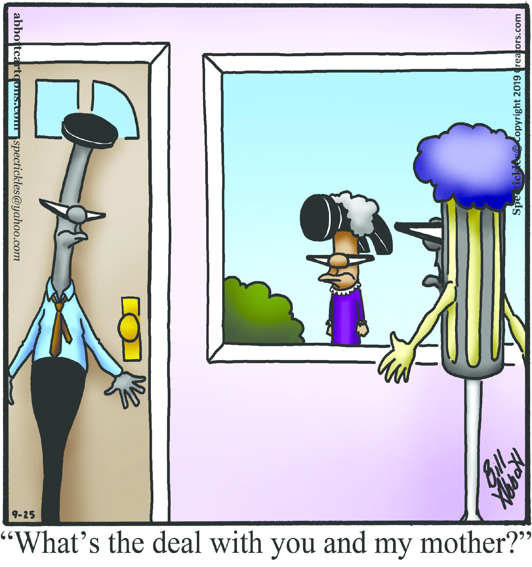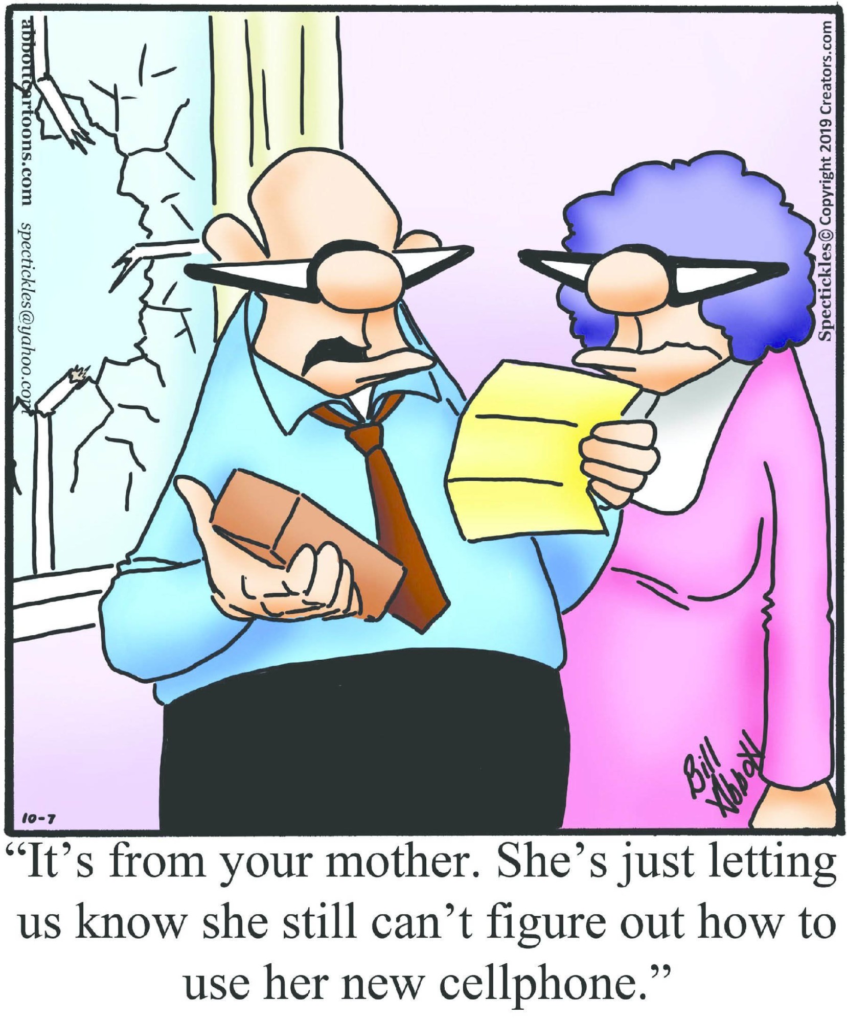 Spectickles, a cartoon primarily about a married couple with, to put it mildly, communication challenges, is an amalgamation of physical traits that author Bill Abbott finds humorous: the deadpan expression and gravity-tugged flesh of Walter Matthau, the powerful presence of Ethel Merman, the glasses of his great-grand-parents and a host of other subtleties. Creators Syndicate