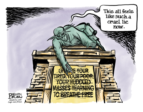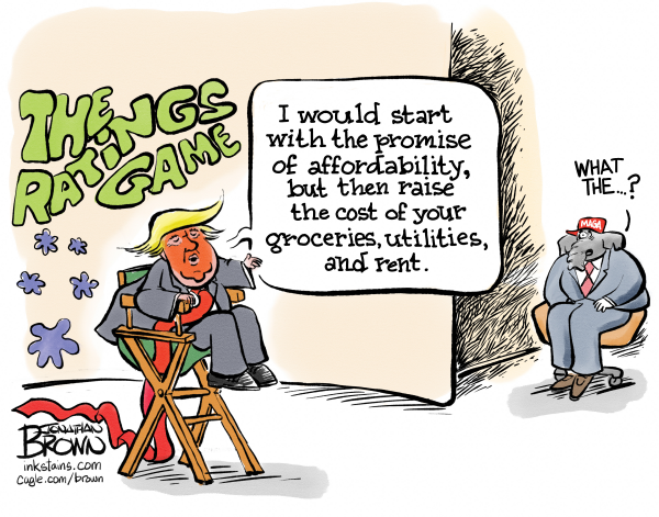 Jonathan Brown was the editorial cartoonist for the Deseret News in Salt Lake City, for many years, winning many awards. He became a freelance cartoonist, drawing for scores of clients and he created the comic strip “Analog,” which follows roommates Bradley, a human, and Nigel, a dog who identifies as a cat, as they navigate life in the digital era. Cagle Cartoons